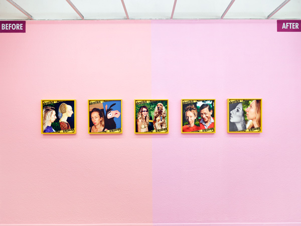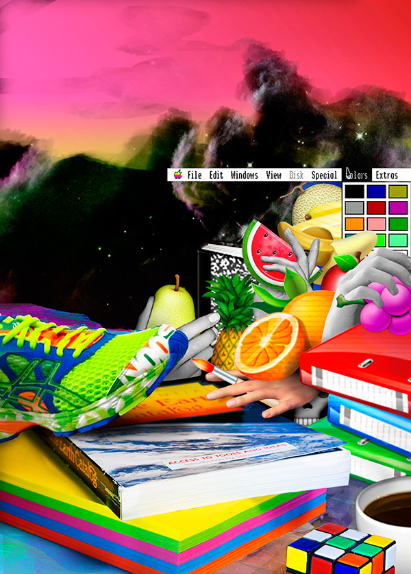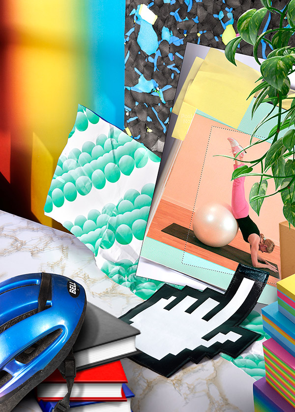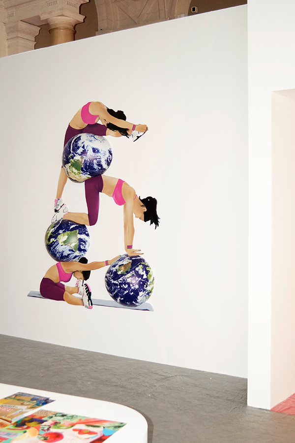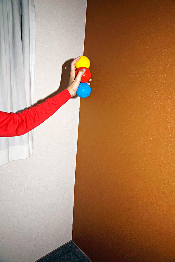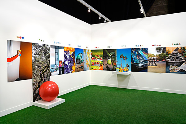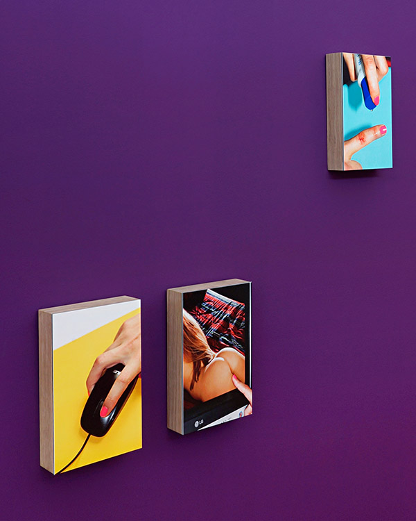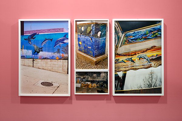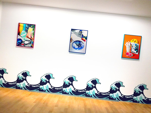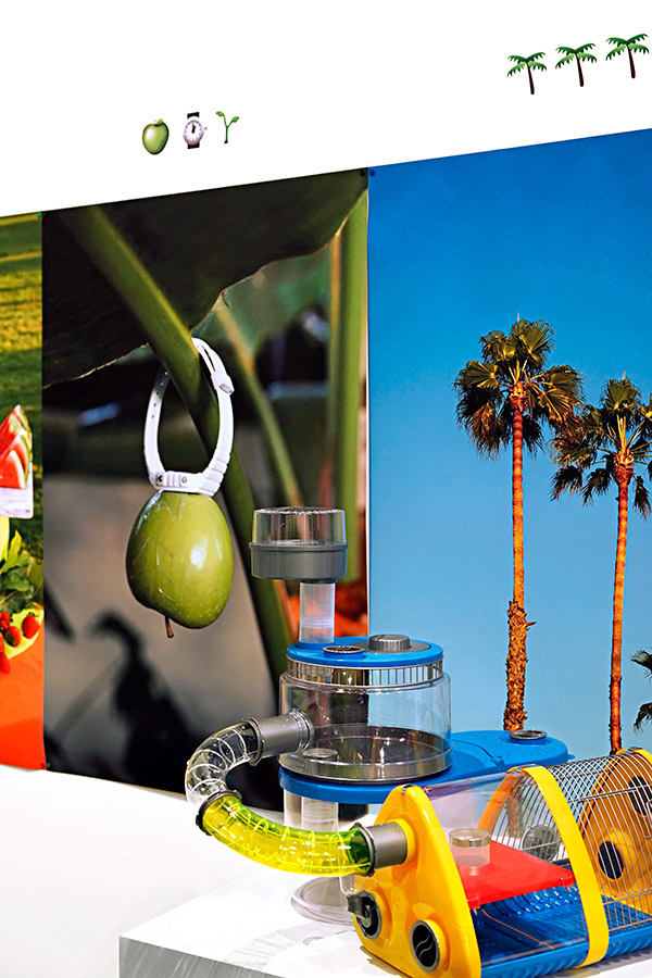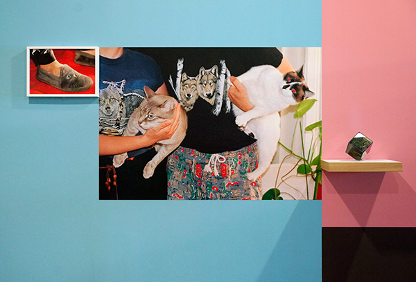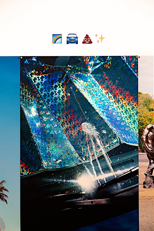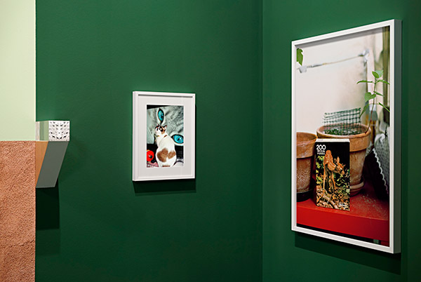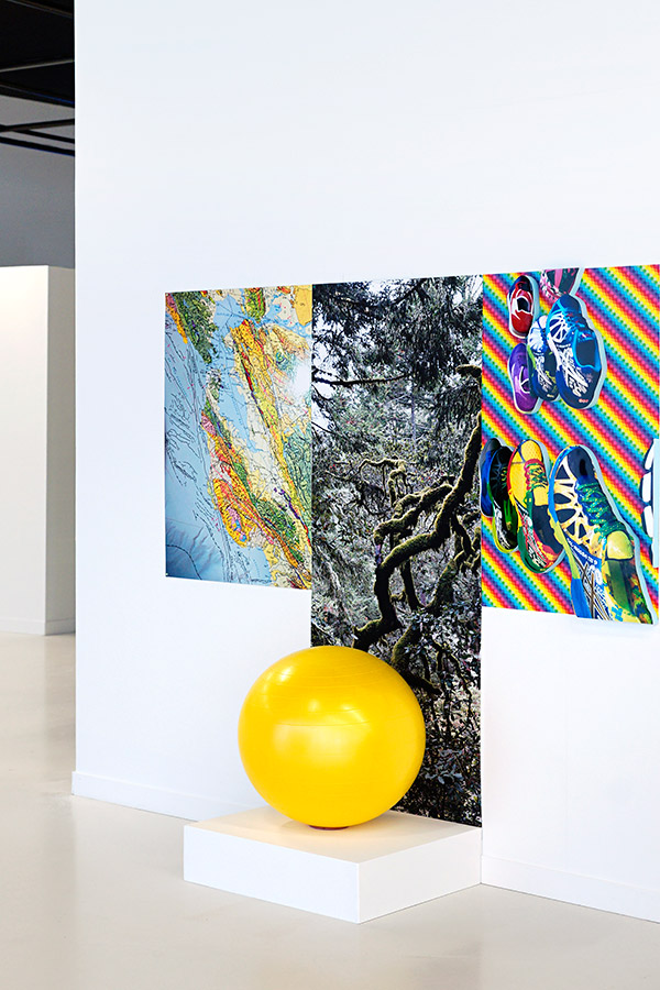 giclee prints, photos-reliefs, shelves, hamster cages, gym ball,, emojis